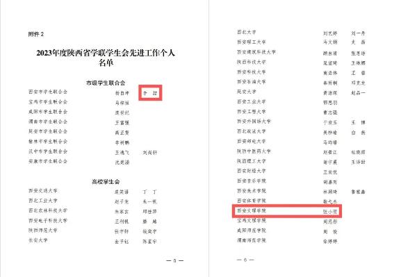 近日、陕西省学生联合会印发《关于2023年度陕西学联学生会组织工作述职评议结果的通报》,我校2020级信息工程学院学生、西安市学生联合会主席李喆;2021级马克思主义学院学生、校学生主席团成员张小雨荣获“2023年度陕西省学联学生会先进工作个人”。